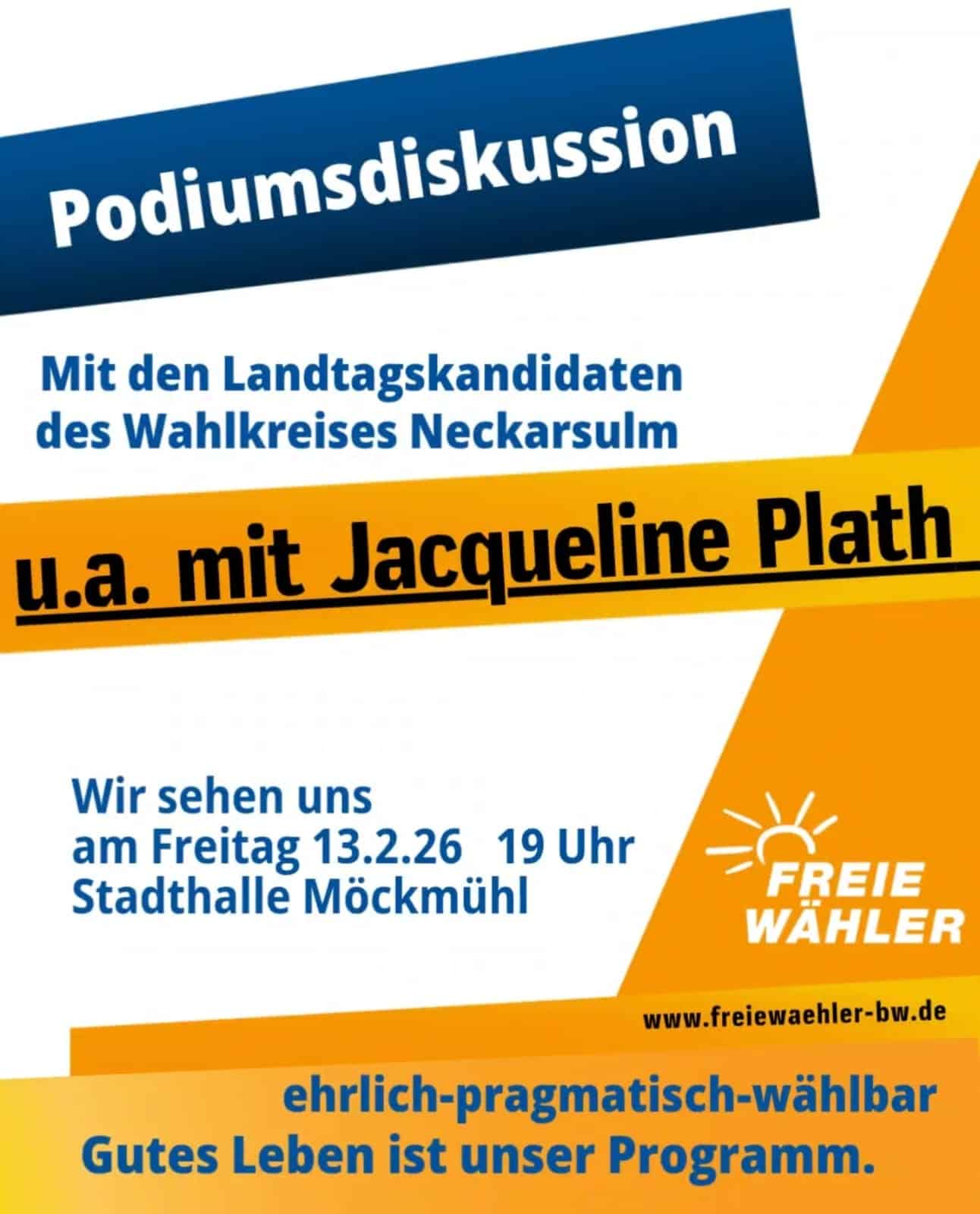 Unsere Wahlkreiskandidatin Jacqueline Plath (Listenplatz 9, Wahlkreis Neckarsulm (20)) nimmt als Podiumsteilnehmerin an einer Podiumsdiskussion zu Bildung und Wirtschaft teil. Im Foyer der Stadthalle gibt es einen Werbestand. Vor und nach der Diskussion findet Bewirtung statt.