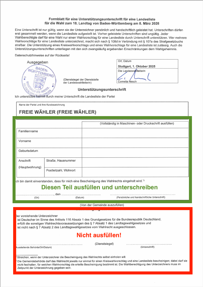 Unten finden Sie einen Link zu einem Unterschriftenformular für die FREIE WÄHLER Landesliste Baden-Württemberg.